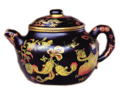 宜興窯紫砂黑漆描金吉慶有余壺 清乾隆