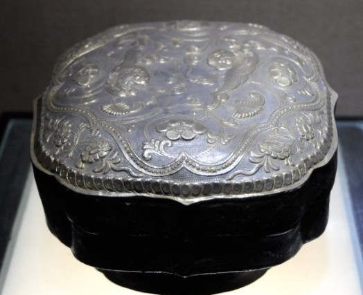 盒高12.0厘米,長(zhǎng)17.3厘米,寬16.8厘米。盒體作四出菱弧形,之為直口,直壁,淺腹,平底,喇叭形圈足。鈑金成 型,紋飾鎏金。盒蓋、盒身,上下對(duì)稱,以子母口扣合。蓋面隆起,鏨有奔獅、西蕃蓮和蔓草。盒蓋、盒身各鏨一圈二方蓮葉蔓草,并以魚子紋為地。盒底緣鏨一圈蓮瓣紋。它是唐懿宗延慶節(jié)進(jìn)奉用器。