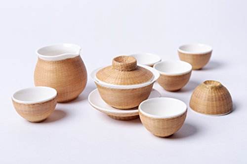 到了清朝,市面上出現(xiàn)了一種竹編茶具,此類茶具是由瓷胎搭配外部竹編包裹而成,內胎多為陶瓷材質,包裹部分選用精挑 細選的慈竹,經過破竹、去節(jié)、劃絲等十幾道工序,加工后的竹絲細如青絲,經上色處理后,按茶具的形態(tài)大小編織而成,形成嚴密包裹胎體的外衣。且在泡茶過程中加上竹編外衣的保護,可 減少茶具對皮膚造成的灼熱感。