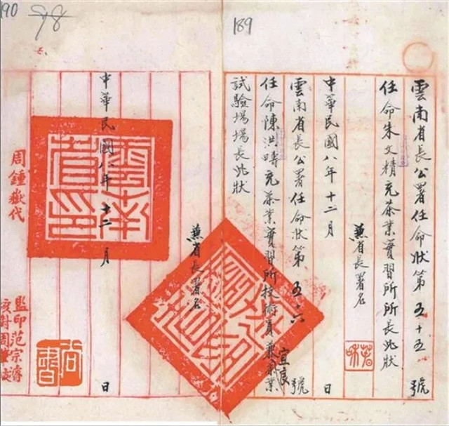 1919年12月,云南省長公署任命朱文精為茶業(yè)實習(xí)所所長的委任狀