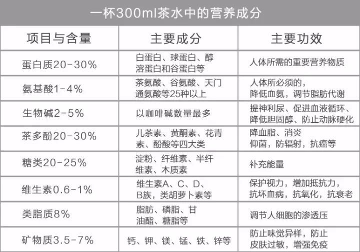 據(jù)科學(xué)家分析和鑒定,茶葉中含有300多種對人體有益的化學(xué)成分。其中包含大量的蛋白質(zhì)、氨基酸、脂肪、碳水化合物、礦物質(zhì)、微量元素以及維生素,其中維生素多達(dá)10余種,泡茶時多數(shù)可溶解在水中,能被充分利用。