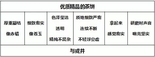 有的茶餅表面光彩而內(nèi)在灰暗,也有的茶餅內(nèi)里實(shí)在潔凈而外表質(zhì)樸。茶餅外表如同人的容貌各不相同,很難一概而論??偠灾?,色澤瑩潔透明并且顏色不混雜,質(zhì)地細(xì)致嚴(yán)密而不輕浮,拿起來感覺密實(shí),碾碎時(shí)聲音清亮,這些都可以表明是精品好茶。茶葉的鑒別,有的可以通過具體的言語和意旨來表達(dá),有的只能心中領(lǐng)會(huì)了。