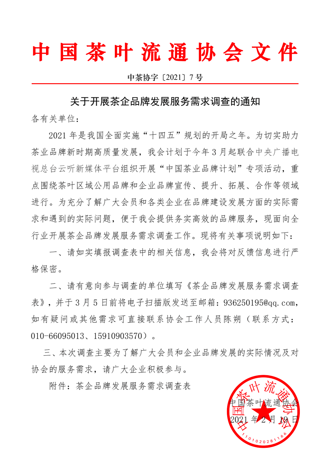 中國茶葉流通協(xié)會關(guān)于開展茶企品牌發(fā)展服務(wù)需求調(diào)查的通知