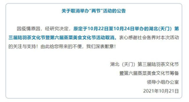 據(jù)湖北(天門)第三屆陸羽茶文化節(jié)暨第六屆蒸菜美食文化節(jié)籌備領(lǐng)導(dǎo)小組辦公室最新公告,因疫情原因,經(jīng)研究決定,原定于10月22日至10月24日舉辦的湖北(天門)第三屆陸羽茶文化節(jié)暨第六屆蒸菜美食文化節(jié)活動取消。