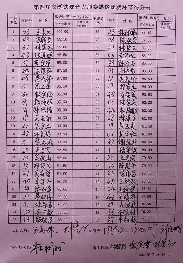 據(jù)主辦方介紹,今年舉辦的第四屆安溪鐵觀音大師賽延續(xù)了前三屆大師賽的賽制規(guī)則。根據(jù)規(guī)則,烘焙比賽要求選手必須在規(guī)定的8個小時內(nèi)用烘焙組委會統(tǒng)一提供的毛凈茶和烘焙機械,獨立完成烘焙。7月17日下午,本次烘焙比賽茶葉評審組四位評委對50位選手的烘焙茶樣進(jìn)行質(zhì)量審評,按質(zhì)量高低排定名次。經(jīng)過四小時的認(rèn)真審評,第四屆安溪鐵觀音大師賽烘焙比賽環(huán)節(jié)得分表出爐。